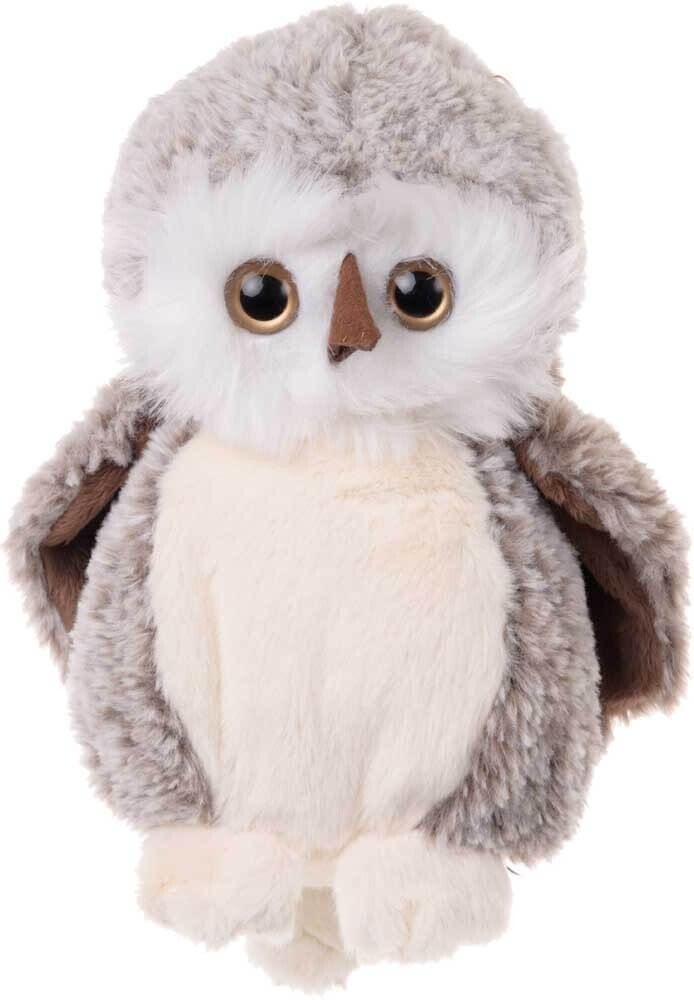 Die Plüscheule „Great Hoho“ ist aus einem auffälligen grau-weißen Stoff gefertigt. Ihr Fell ist dicht und recht lang. Die Eule hat große, schwarze Augen und eine weiche, braune Nase. Ihre Flügel sind ausgebreitet und innen mit dunkelbraunem Plüsch gefüttert. Die Eule ist 25 cm groß.